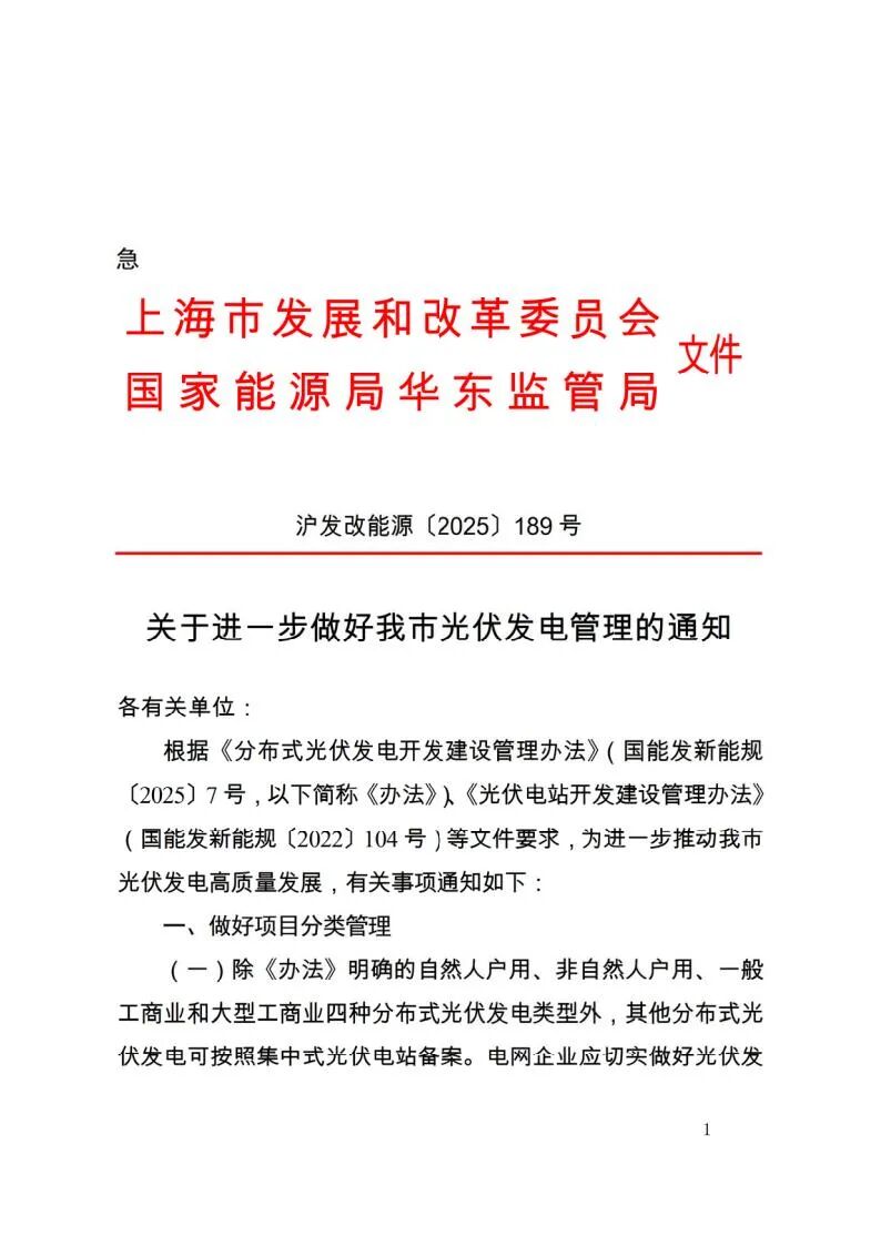 10月24日,上海市发改委发布关于进一步做好我市光伏发电管理的通知。文件指出,除《分布式光伏发电开发建设管理办法》(国能发新能规〔2025〕7号)明确的自然人户用、非自然人户用、一般工商业和大型工商业四种分布式光伏发电类型外,其他分布式光伏发电可按照集中式光伏电站备案。