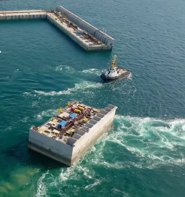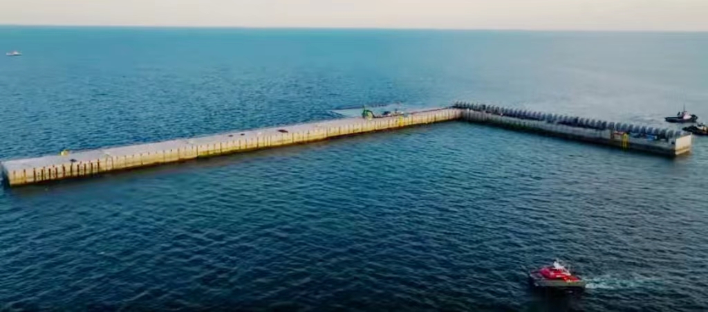 本次海上作业历时数月,投入15艘特种船舶及300余名作业人员。作为人工岛的"钢铁城墙",每座沉箱长57米、宽30米、高30米,重约22000吨,它们构筑起防护屏障,为后续电力设施建设提供安全保障。