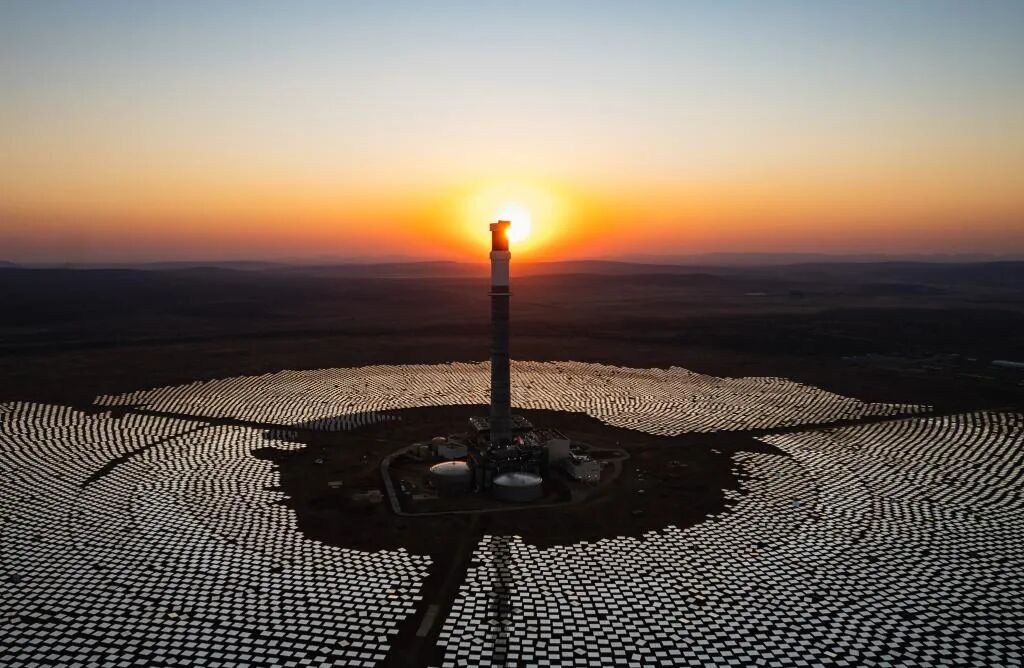 南非北开普省的南非红石100兆瓦塔式熔盐光热电站项目。图源:新华社