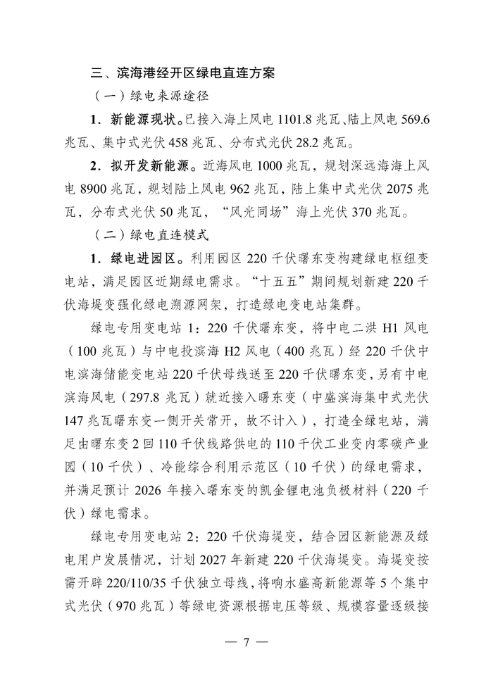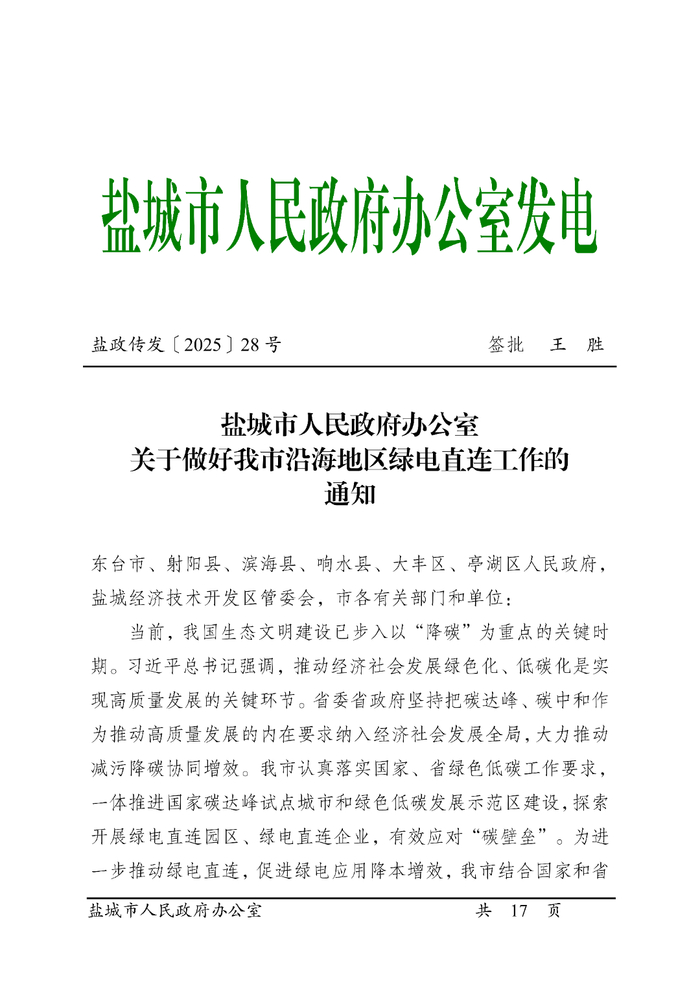 日前,盐城市人民政府办公室印发《关于做好我市沿海地区绿电直连工作的通知》,对沿海7个区域(东台沿海经济区、射阳港经开区、滨海港经开区、响水工业经济区、大丰港经开区、亭湖区环保科技城、盐城经济技术开发区)出台“一县一策”绿电直连方案,旨在通过明确绿电来源、优化直连路径、降低应用成本,推动绿电直连规模化落地。