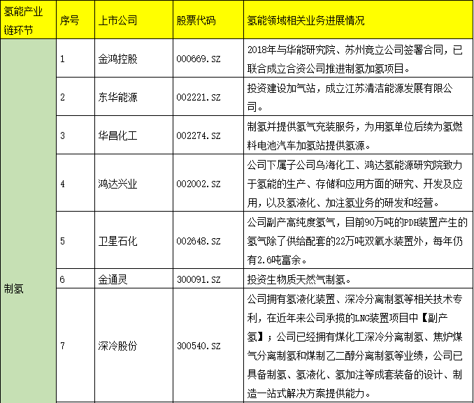 根据香橙会统计显示,氢能上游制氢环节,总共有13家上市公司参与。其中,深冷股份(300540.SZ)主要是氢气液化,目前已处于批量生产阶段;华昌化工(002274.SZ)主要是化工制氢;中国神华(601088.SH)煤炭制氢,公司参与了张家口示范项目。