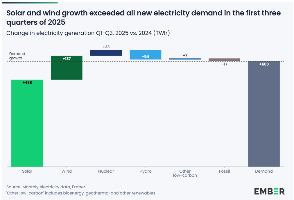 太阳能和风能的扩展速度已足够快,足以满足所有新的电力需求,这一里程碑在2025年前三个季度达成。Ember于去年11月发布的分析显示,这些技术不再只是赶上了;它们本身已经超过了需求增长。太阳能和风能在2025年前三个季度共供应了全球电力的17.6%,高于去年同期的15.2%,使低碳能源总份额达到43%。