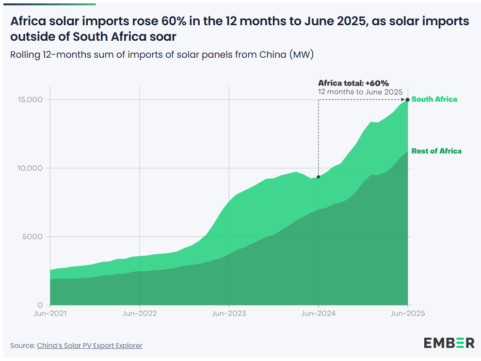 2025年8月,Ember报道称,非洲范围内太阳能的加速有明确证据。截至2025年6月的12个月内,中国太阳能电池板进口增长了60%,南非仍是最大买家,但其他20个国家也发布了创纪录的订单。总进口容量达到15吉瓦,较前一年的9.4吉瓦有所提升。一些市场出现了显著的跳升。阿尔及利亚的进口量增长了33倍,赞比亚增长了8倍,博茨瓦纳增长了7倍,苏丹增长了6倍,而利比里亚、刚果民主共和国(DRC)、贝宁、安哥拉和埃塞俄比亚的进口量则增长了三倍以上。