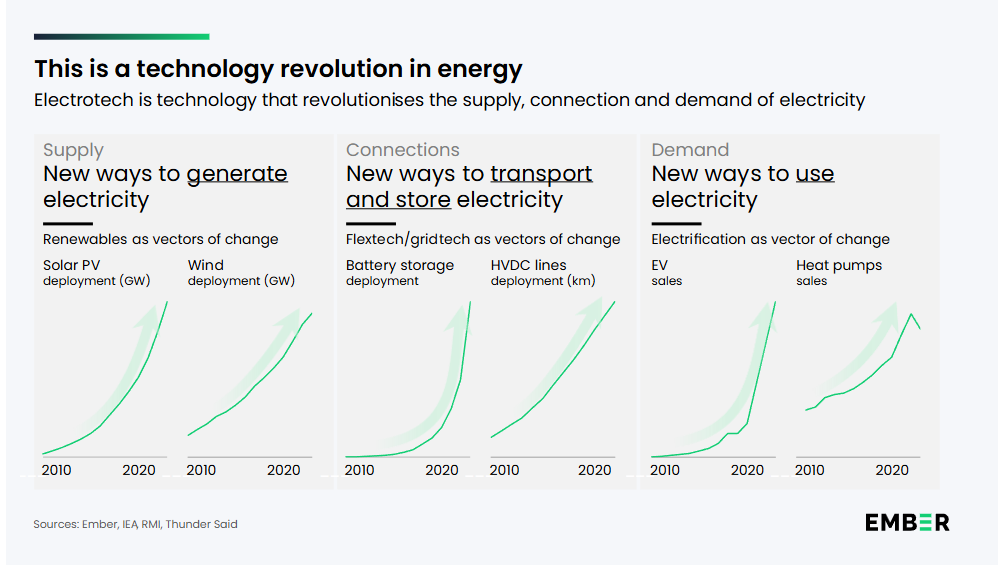 Electrotech是一套高效且可扩展的电力技术,如太阳能、风能、电池、电动汽车和热泵,现已成为全球能源增长的主要驱动力。太阳能装机容量在30年间大约每三年翻一番,自2020年以来电池储能几乎每年翻一番,电动车销量自2017年以来激增十五倍,达到1750万辆。中国,作为世界上第一个“电国家”,引领了这一转型。自2019年以来,它占全球太阳能电池板安装量的一半,电动汽车销量的60%,以及全球电力需求增长的三分之二。2025年上半年,中国发电中的化石燃料需求下降了2%。从越南到墨西哥,从南非到印度的新兴市场正在超越旧有的化石系统,在太阳能用电量上超过美国。掌握电池、电机和电力电子等电气技术栈,现在对工业增长、就业和战略自主至关重要。