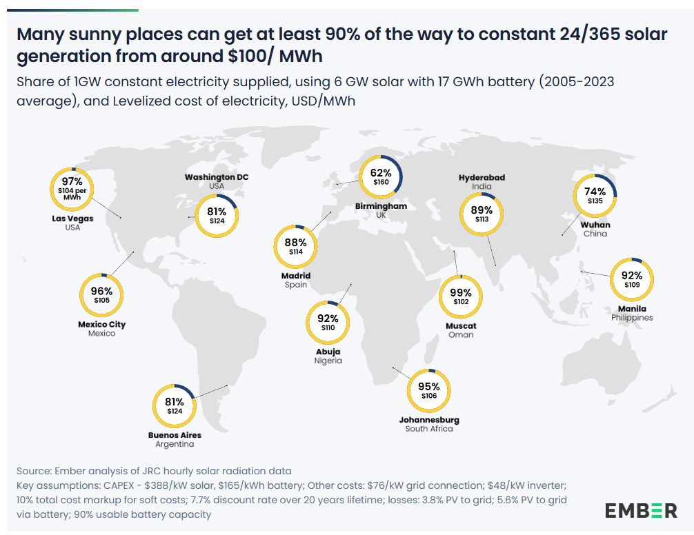 Ember 2025年6月的分析显示,在高日照地区,太阳能配合电池已能全天候提供约104美元/兆瓦时的电力供应,低于新建煤炭和核能,使“太阳能作为基载”在技术上更具可信度且成本竞争力日益增强。