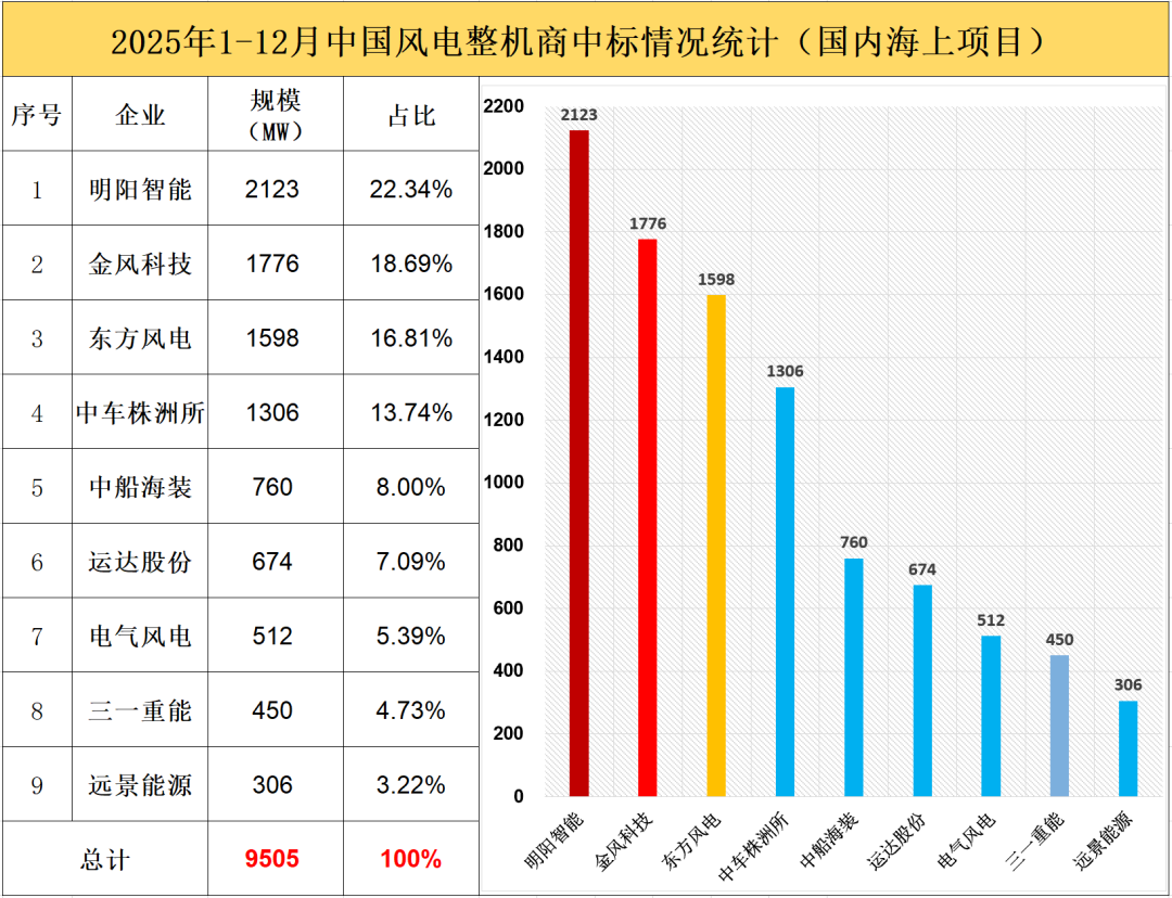 海上项目2025年中标统计特别声明:以上统计数据为每日风电根据公开招标信息及企业提供数据统计,为不完全统计,每日风电会严格审核所有项目数据。每日风电严格遵守对客户的信息保护义务,本文所涉客户项目内容均取自公开信息或取得客户同意。全文内容、观点仅供参考,不代表每日风电任何立场,亦不应当被视为出具任何形式的法律意见或建议。以上统计数据在任何时候均不构成对任何人的具有针对性的、指导具体投资的操作意见,订阅者应当对本公众号中的信息和意见进行评估,根据自身情况自主做出投资决策并自行承担投资风险。每日风电对本公众号所载资料的准确性、可靠性、时效性及完整性不作任何明示或暗示的保证。对依据或者使用本公众号所载资料所造成的任何后果,每日风电及/或其关联人员均不承担任何形式的责任。本公众号中所有资料的版权均为每日风电所有,未经书面许可任何机构和个人不得以任何形式转发、转载、翻版、复制、刊登、发表、修改、仿制或引用本公众号中的内容。