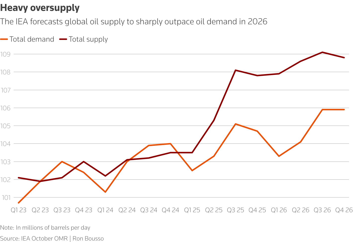 国际能源署(IEA)预测,2026年石油供应将超出需求每日385万桶——相当于全球需求的约4%。然而,OPEC分析师认为明年市场大体平衡,这形成了数十年来最显著的预测分歧之一。