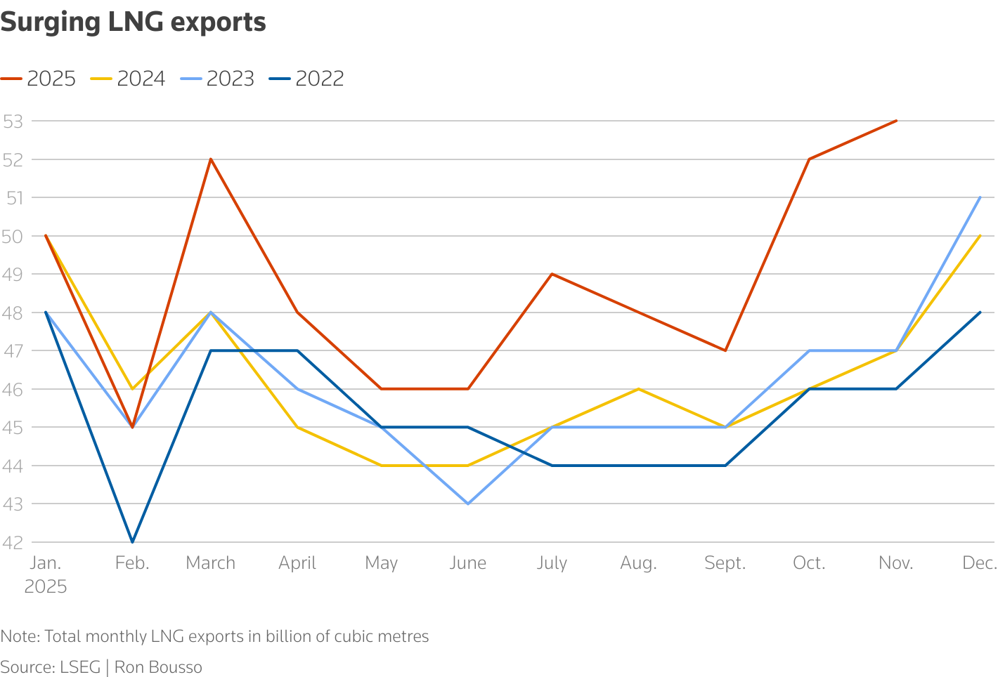 近年来,液化天然气需求激增,尤其是欧洲在2022年俄乌冲突后急于快速替代此前大量进口的俄罗斯管道气。这波繁荣为LNG生产商与贸易商带来巨额利润,但随着全球出口能力持续提升,这种好景可能不会延续。IEA数据显示,2025至2030年间,全球新增LNG出口能力预计每年增加3000亿立方米,增幅达50%;其中约45%来自全球最大出口国——美国。同期供应增速将超过需求增速,挤压生产商利润,并为欧洲与亚洲的消费者带来一定缓解。不过,美国天然气价格上涨将成为生产商的又一难题。尽管如此,生产商仍有乐观理由:随着2026年及以后LNG价格下降,这种超低温燃料将与石油、煤炭等低成本选项更具竞争力,从而可能提振需求。