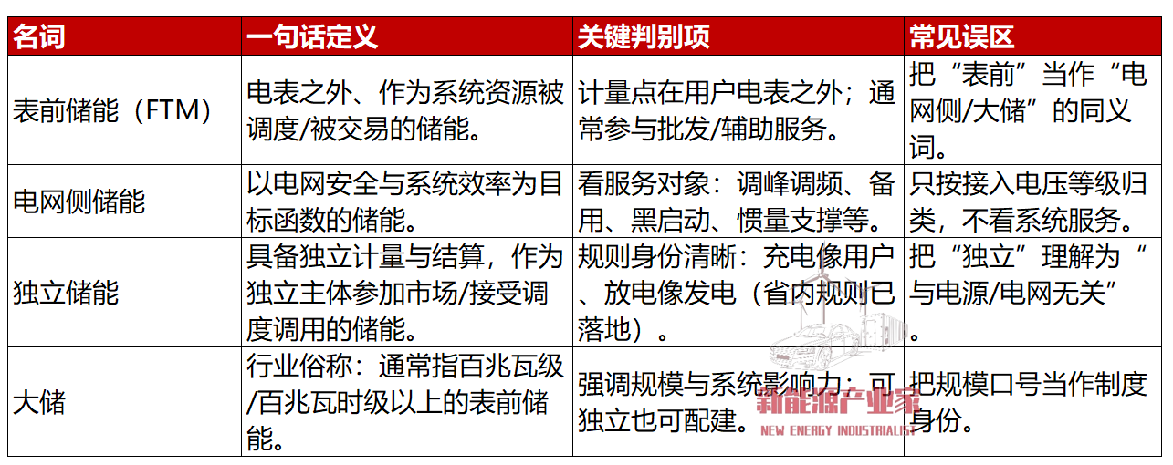 要搞懂独立储能,首先我们要理清四个概念——独立储能、大储、电网侧储能、表前储能。