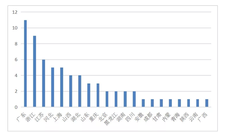 2019年上半年各省份氢能投资项目数量情况(单位:个)