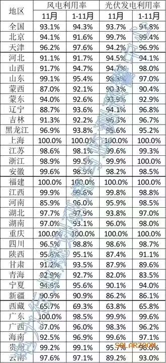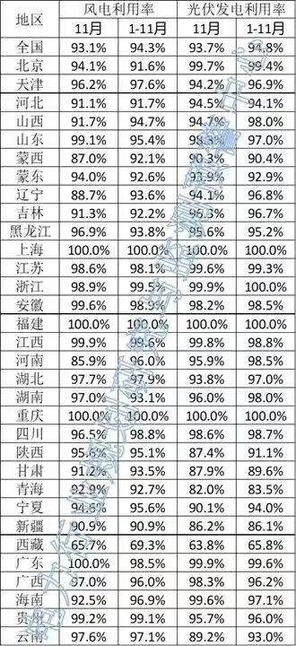光伏方面,上海、浙江、福建、重庆四省市仍保持100%利用率。西藏1-11月利用率65.8%,11月单月利用率63.8%。除西藏外,甘肃、青海、新疆三省1-11月利用率也在90%以下。河北、蒙西、蒙东、陕西、宁夏、云南六地1-11月利用率在95%以下。