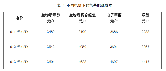 成本问题是制约绿色甲醇、绿氨项目推进的核心,生产成本高度依赖碳源(生物质原料/捕集CO2)、氢源(绿氢/生物质原料)和绿电价格。以生物质成本750元/t,CCUS捕集CO2成本320元/t的边界测算,不同可再生能源电价对应的氢基能源成本如下表: