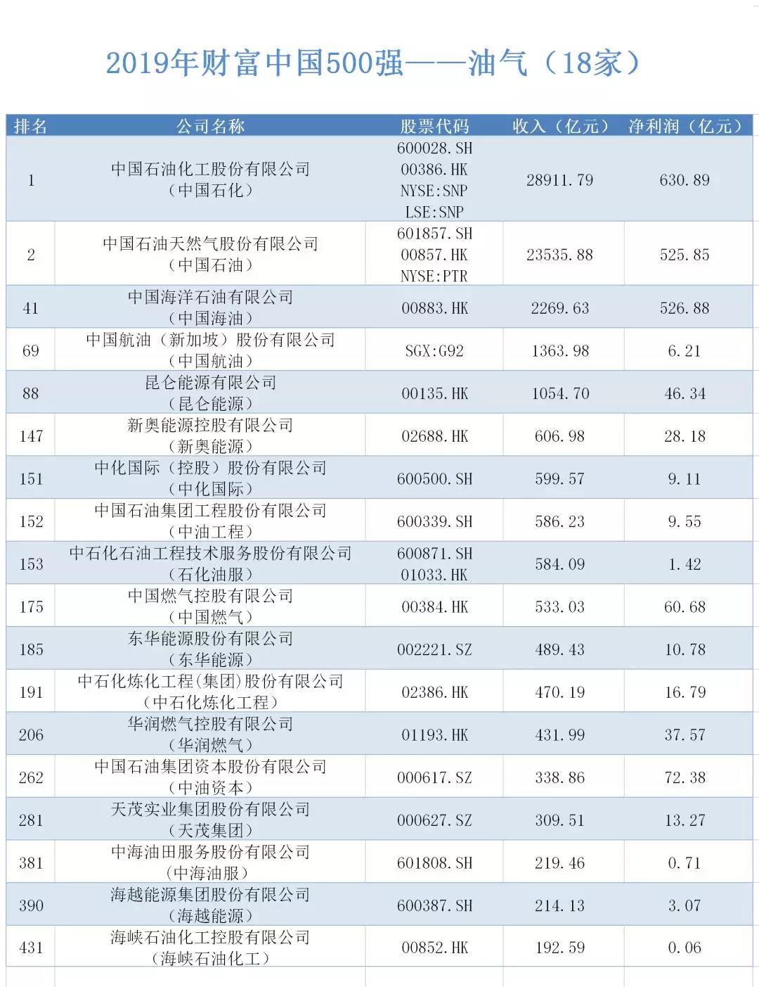 100家能源上市公司入选2019财富中国500强,中国石化与中国石油蝉联冠亚军。