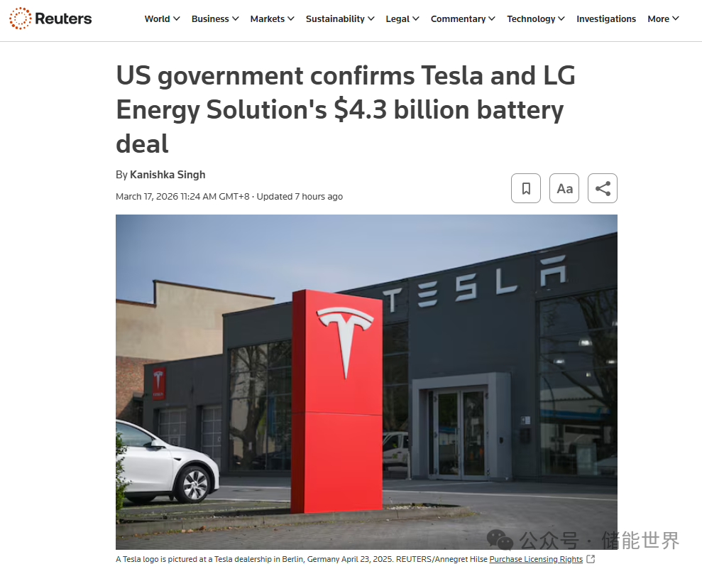 官宣落地:43亿美元大单浮出水面据路透社最新报道,美国政府已正式确认全球电动汽车巨头特斯拉(Tesla)与韩国LG新能源(LG Energy Solution)达成了一项重大合作。