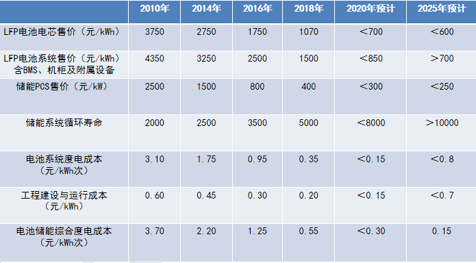 得益于电动汽车产业的发展,带动了锂离子电池成本的下降,锂电池在电力储能应用具备一定的经济性。如下表所示: