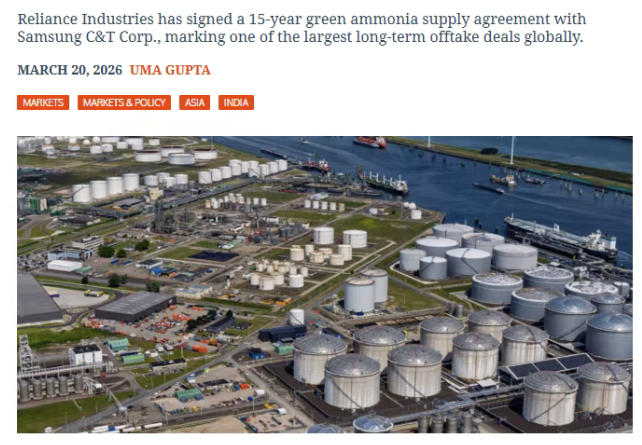 近日,印度最大民营企业信实工业(Reliance Industries)已与韩国三星物产公司(Samsung C&T Corp.)签署了一份为期15年、总额超30亿美元(约合人民币206.78亿元)的绿氨购销协议,成为全球绿色燃料领域规模最大的长期约束性协议之一。