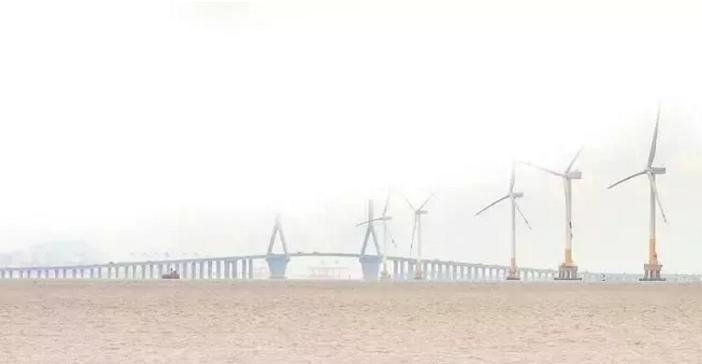 大桥东侧的34台风机是最早的一期项目,单台功率达到3000千瓦,是当时陆上最大风机的两倍。张开华在接受采访时说,起步的示范项目就是10万千瓦,这不仅是亚洲最大,也是亚洲首个大型海上风电场。