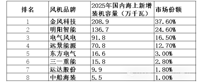 明阳智能:2025年海上新增装机136.7万千瓦,市场份额24.6%,紧随其后。