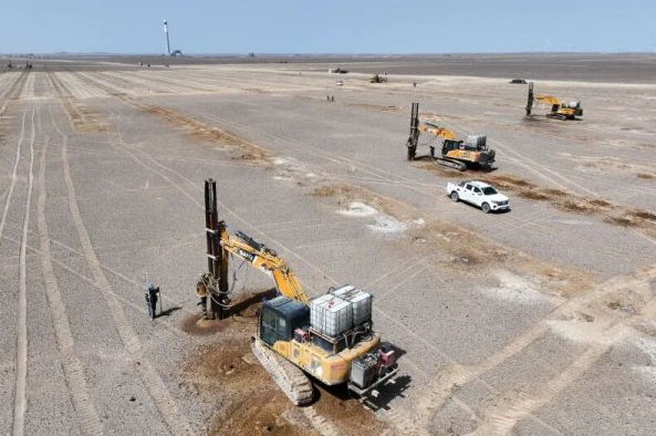 中国能源建设集团新疆能源发展有限公司副总经理张伟说:“今年4月1号,1350兆瓦的光伏项目全面开工建设,目前正分成四个标段,各个标段都在进行钻孔浇筑、桩基的施工,计划是在6月底之前桩基全部打完,在9月到10月,光伏场区全部安装完,年底前光伏能全部具备并网条件。”