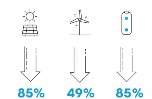 2010年以来,太阳能、风能和电池的成本下降比例