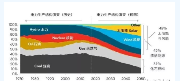 根据BNEF对综合技术发展趋势和能源成本的分析,到2050年,煤电在全球能源中的占比将从目前的37%下降至12%,而石油将基本消失。风能和光能则会从目前的7%上升至2050年的48%,水力、天然气、核能占比则在1%上下浮动。