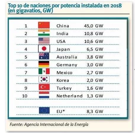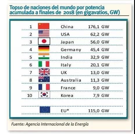 2018年是创纪录的一年。在人类历史上首次,该行业已安装(只有十二个月)的新太阳能光伏发电(PV)超过100亿瓦。因此,全球光伏机队已超过五百公里(500吉瓦)。11个国家已向其各自的国家太阳能公园增加了超过一千兆瓦(超过一场演出)。因此,越来越多的国家开始进行太阳能转型。因为在2017年只有九个国家安装了超过一千兆字节; 并且,最重要的,因为在2019年的期望是,将有16个国家,千兆,即国家,今年将关闭已经安装超过一千兆瓦的新光伏发电。
