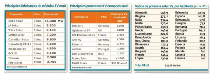 天文台以114,549分列了FV大陆公园已有的兆瓦。超过一半的国家只有两个国家:非常阳光明媚的德国和英国。在2018年,旧大陆的机车连接了近3000兆瓦的FV。非常活跃的也是荷兰的市场(1,400兆字节)。他还曾在一个良好的步伐法国,已连接862总体而言,因为是说7,606兆瓦在2018年,有5,690上年相比。据EurObserv'ER,这种复苏表明,大型太阳能园区的转型经历了一个市场模式,没有援助已经完成。价格的下降,太阳能电池组件和拍卖在关键的欧洲太阳能市场(德国,荷兰,法国)的定期出版一直负责“复兴” 根据EurObserv'ER的说法,鉴于越来越多的欧洲国家的网络平等背景,它也看到了自我消费的明亮场景。该报告最后重点介绍了两个最新数据:十大太阳能组件制造商中,八个是中国人; 在欧洲十大光伏开发商中,没有一家是西班牙语。