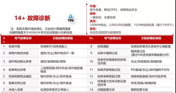 另外传统的专业仪器只会测试,并不具备专业分析能力。而智能 IV 检测技术,不仅能实现每个组串的扫描测试,而且能迅速评估组串健康状态,输出故障报告,并给予前瞻性维护建议,做到“带着解决方案进场”。