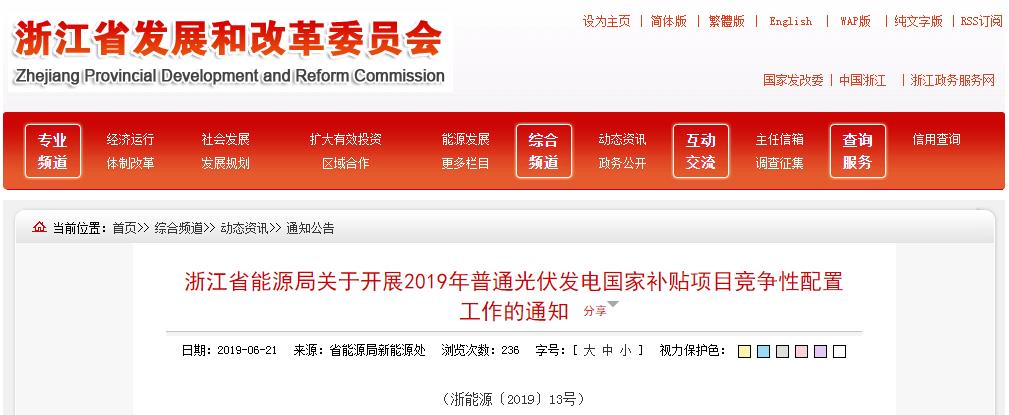 浙江省能源局关于开展2019年普通光伏发电国家补贴项目竞争性配置工作的通知