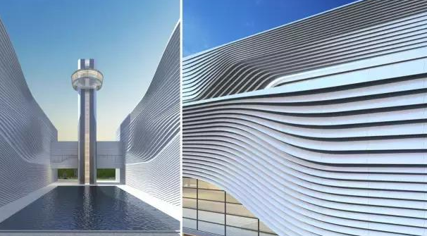 立面采用曲线状、并且局部翻起的氟碳喷涂铝单板幕墙,以一条条高低起伏的曲线形成海浪般的形态,同时每一条铝板又以不同的趋势逐渐翻起落下,不但利用铝板间的缝隙满足内部焚烧、净化车间通风的需求,更使得建筑整体的立面如同运动中的波纹一般生动,令建筑体量充满动感。