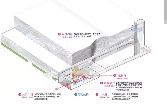 在参观流线设计中,针对不同的人群设计了不同类型的参观流线,包含快速参观流线、全程参观流线及专业参观流线,满足了不同身份人群进入参观的需求,同时结合玻璃观光廊、屋顶绿化,蒸汽主题花园等创造丰富的参观体验。