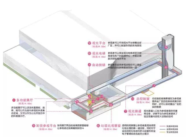 本项目作为民众与学生的科普基地,充分展示了国内最先进的垃圾焚烧技术。项目利用南北工房中间的间隙设置了参观区,形成与主工房一体化的完整造型。