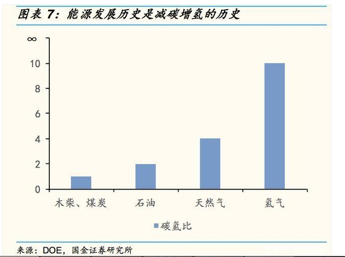 1)从环保的角度来看,煤炭的碳氢比是1:1,石油的碳氢比是1:2,天然气的碳氢比是1:4,氢气零碳排最为环保。2)从能量密度来看,煤炭的能量密度是木柴的160倍,石油的能量密度是煤炭的2倍,氢气的能量密度是石油的3倍,氢气能量密度最高。