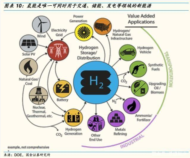 氢能优势突出、是唯一可同时用于交通、储能、发电等领域的新能源。1)氢能作为清洁的二次能源,具备来源广、能量密度高、可储存、可再生、0噪音、0污染的优势,是唯一可同时用于交通、储能(可用氢来储存风能、太阳能)、发电等领域的新能源。