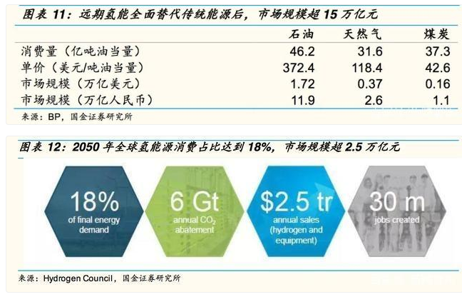 氢能全面取代传统能源市场规模超15万亿。参考2017年传统能源消费量及单价,远期氢气全面替代传统能源后,市场规模达15.5万亿元。根据国际氢能委员会的预测,到2050年全球氢能源消费占总能源需求的18%,市场规模超2万亿。