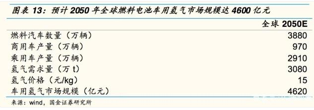 预计2050年全球燃料电池车用氢气市场规模达4600亿元。假设2050年全球汽车产量约9700万辆,燃料电池车占新车产量40%的份额其中商用车占比25%。商用车日行驶里程300km,乘用车日行驶里程40km,商用车百公里耗氢量2.5kg,乘用车百公里耗氢量1kg,参考METI氢气价格,假设2050年氢气价格降至15元/kg,全球燃料电池车用氢气市场规模达4620亿元。