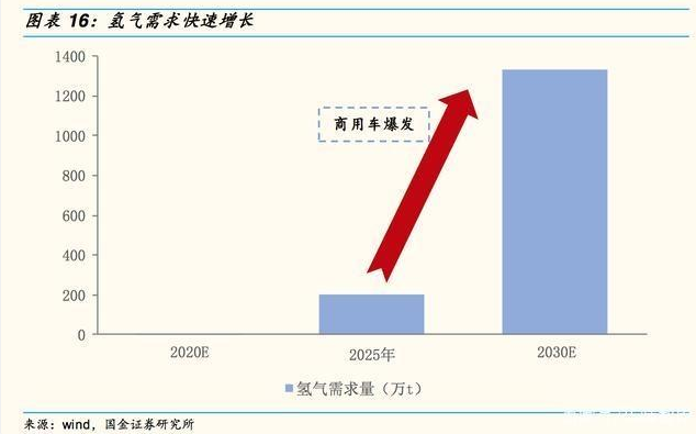 氢气需求快速增长。我们预计2020年燃料电池车销量达1万辆,主要为城市客车、城市物流车;伴随系统成本、氢气成本下降,2025年燃料电池车销量超25万辆,重卡市场逐步爆发;2030年燃料电池车销量超160万辆,主要为重卡。假设客车、物流车、重卡日行驶里程300km,客车百公里耗氢量5kg,物流车、重卡百公里耗氢量2.5kg,对应2025年氢气需求超200万吨,2030年氢气需求超1300万吨。