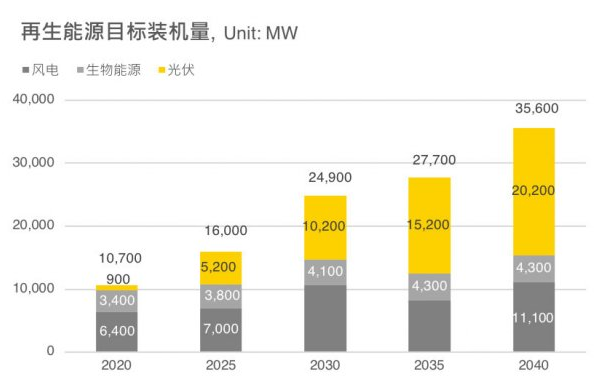 于2018年11月份发布2040能源政策(PEP2040),文中订定将于2020、2030年分别达到15%以及27%的再生能源发电量占比,其中锁定的再生能源项目为光伏、风电以及生物能源(含生质能、沼气)。