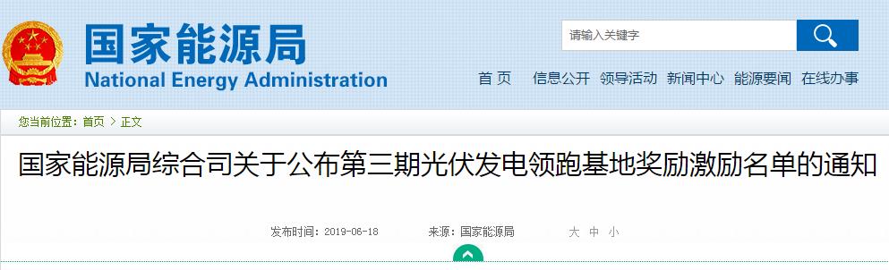 国家能源局综合司关于公布第三期光伏发电领跑基地奖励激励名单的通知
