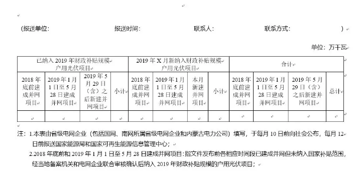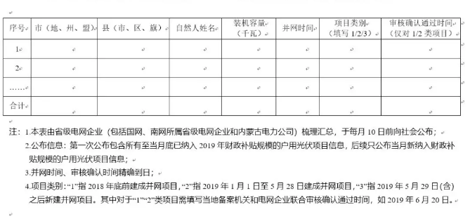 三、请相关省级能源主管部门组织地方电网企业于每月8日前按附件1、2向国网、南网所属省级电网企业和内蒙古电力公司报送户用光伏项目信息。各省级电网企业(含内蒙古电力公司)于每月10日前按附件1、2公布汇总后的全省户用光伏项目信息,并于每月12日前按附件1报送国家能源局,并抄国家可再生能源信息管理中心。2019年第一次信息公布和报送从7月开始,以后按月定期公布和报送信息。