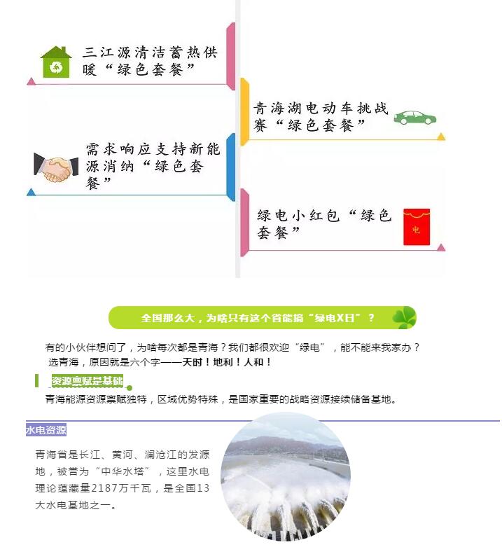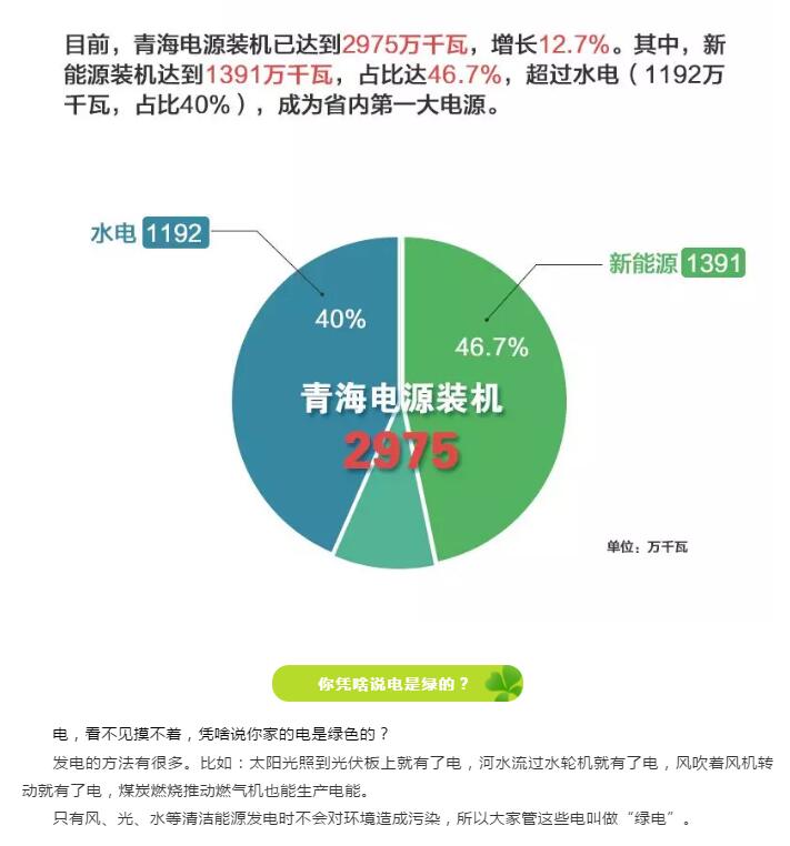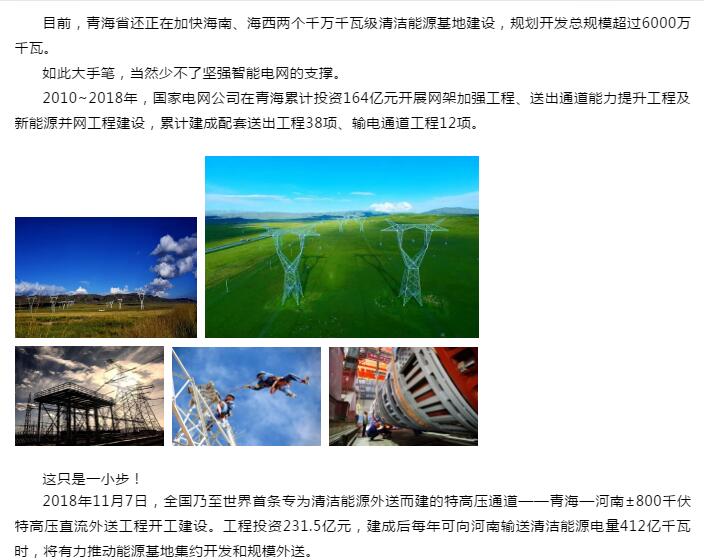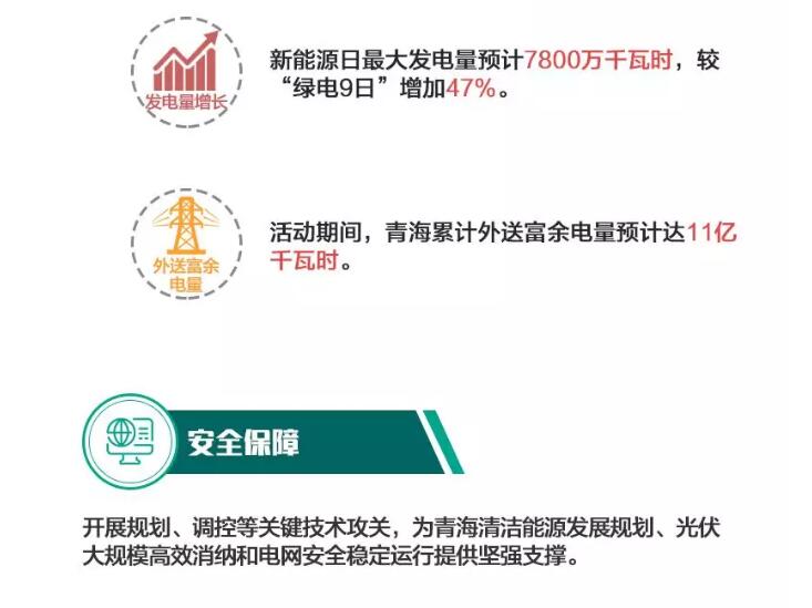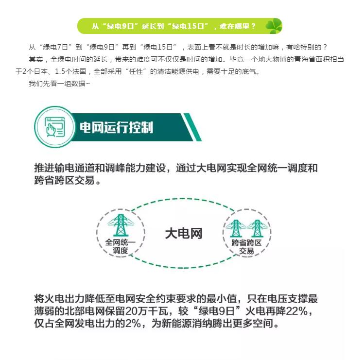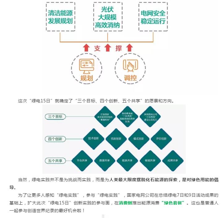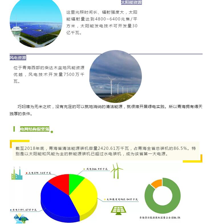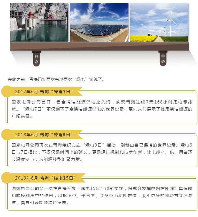 2019年6月9日0时至6月24日0时,国家电网在青海省组织实施“绿电15日”创新实践,其间该省所有用电均来自水、太阳能以及风力发电产生的绿色能源,实现青海全省连续15天360小时用电零排放。