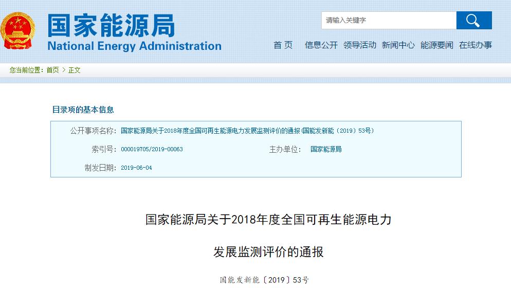 国家能源局关于2018年度全国可再生能源电力发展监测评价的通报