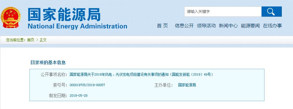 国家能源局关于2019年风电、光伏发电项目建设有关事项的通知