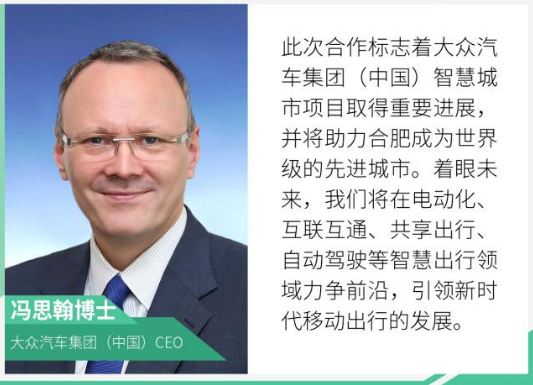 同日,大众汽车集团(中国)携手旗下全资子公司逸驾智能科技有限公司与合肥市人民政府及江淮汽车就落户安徽合肥的智慧城市项目在巴塞罗那签订战略合作框架协议。该智慧城市项目旨在提升合肥市的政务服务品质和市民福祉、助力合肥成为世界级的智慧城市,同时也将为大众汽车集团提供更多在新技术研发、新商业模式验证和产品创新等领域的机遇。