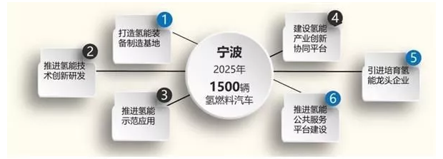 具体包括,围绕制氢、运氢、储氢、加氢以及燃料电池全产业链,以江北区等为核心,重点打造氢气制备、双极板、膜电极、电堆、燃料电池、加氢设备等核心装备制造基地;在北仑区、大榭开发区等地开展加氢站示范建设,探索推进燃料电池公交车、物流车、港区集卡、叉车等应用示范;探索加氢(油、气、电)等综合建站模式;打造氢能创新应用的配套区和孵化区;重点突破化工余热与废气资源高效制取氢气等一批关键技术,将其列入宁波科技创新重大专项等。