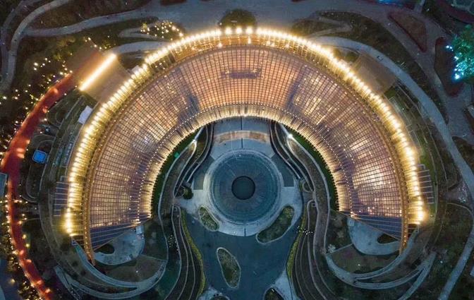 2019年世园会中国馆 金黄色的幕墙和采光屋顶采用光伏发电玻璃