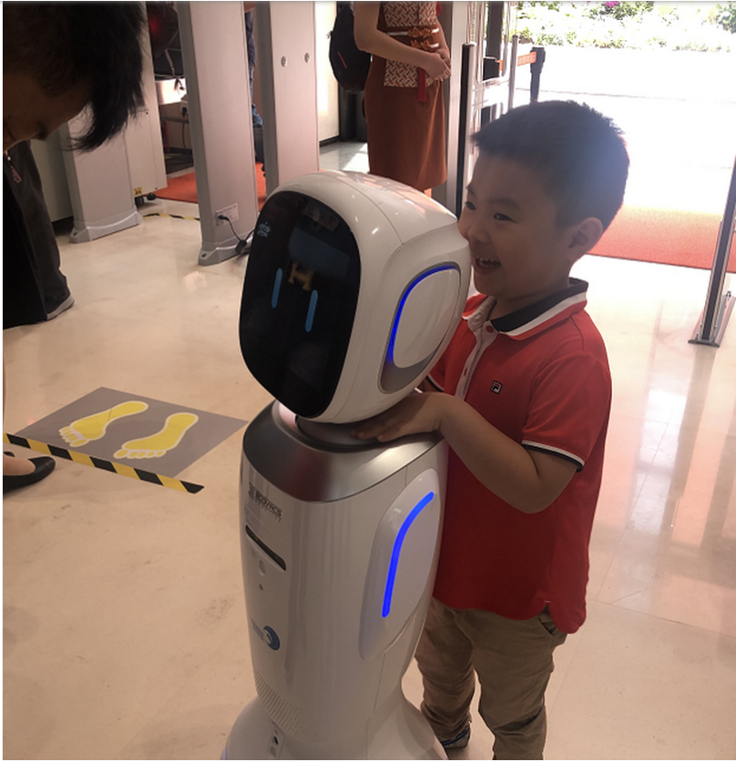被这些街道上的智能技术震撼后,我们再来看看生态城的图书馆。一进门,一个小机器人笑脸相迎,可以和人俏皮对话,还可以领着客人去想去的地点。馆内的孩子们都围着小机器人看“新鲜”。
