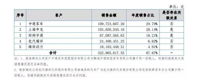 从客户情况来看,报告期内,亿华通前五大客户为中通客车、上海申龙、郑州宇通、北汽福田、潍柴动力,合计年度销售占比达87.67%。