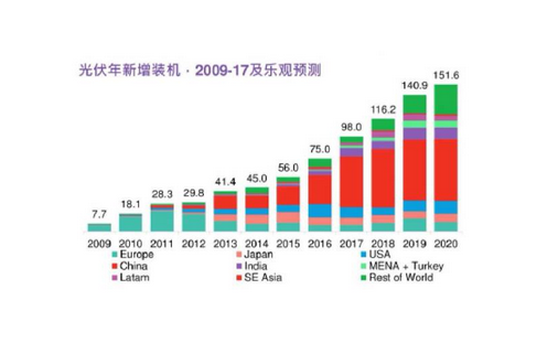 除中国以外的其他亚太国家市场方面,日本2017年装机总量为7.5GW,未来规模会因为BIPV的技术导入,扩大新的市场空间,每年的新增量还会在7GW~10GW以上。印度作为快速发展的光伏市场之一,预计到2020年每年新增装机量约为10-13GW左右。澳大利亚发展也很快,2018年的装机量将超过2GW。