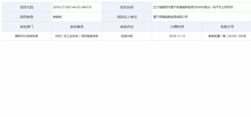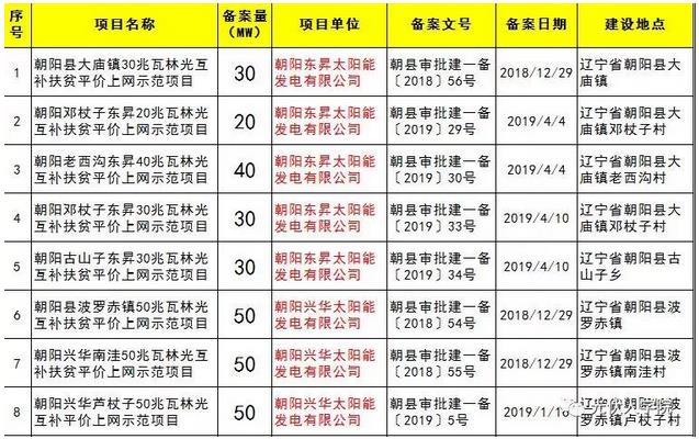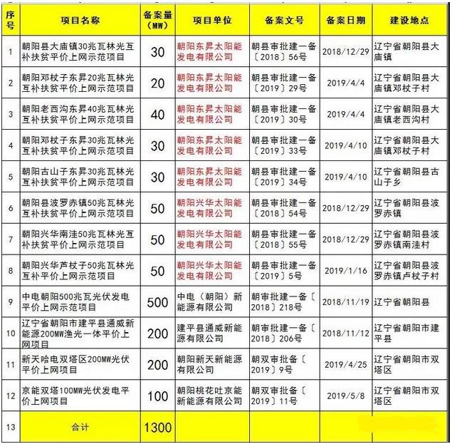 从2018年11月开始,辽宁省朝阳市已经陆续备案了1.3GW光伏平价上网示范项目: